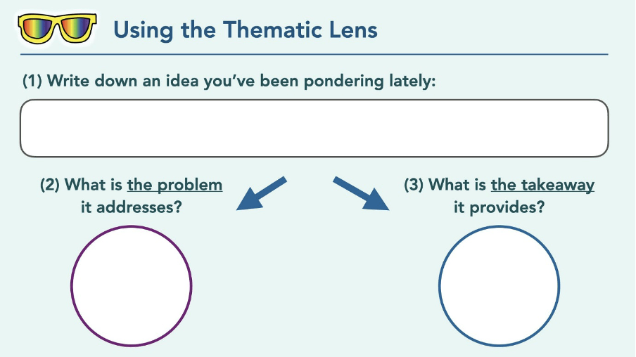 And as it turns out, a theme isn’t just reserved for the story-level. It also goes down to the idea-level as well. But to see it, you have to use the Thematic Lens to break your ideas down into problems and takeaways.