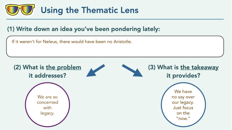 Now I have a concrete problem to build a story around, and a takeaway that will deliver a soft landing. Keep in mind that you could have derived a whole other theme from that idea, and that’s perfectly fine. The Thematic Lens doesn’t yield any one correct answer; it all depends on the person using it.