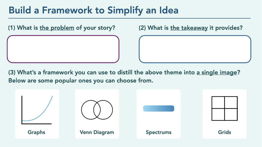 When thinking through the options, try to get a sense of which framework will suit your problem. For example, a Venn diagram will be great if you want to show how two different concepts can converge to deliver an insight. Or a spectrum can indicate the nuances that live between two extremes.