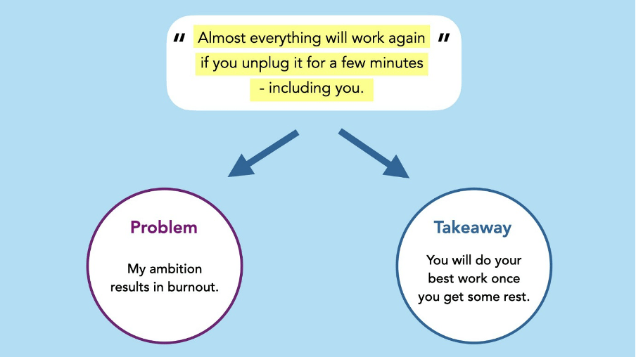 The next step is to find the theme that lives in the idea. In other words, you’ll separate it into a Problem and a Takeaway.