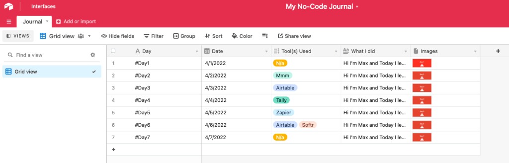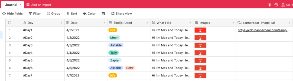 2. Now sign-in to Airtable and jump to your Journal Base. If you’d like to freestyle this with another usecase (e.g. a list of your favouriate coffee shops) it’s best if you create a new Base in Airtable and add at least 10 records worth of data into your new Airtable table. For example, this could be your 10 favouriate cars or Youtube channels. To make the end result look great, add a column for images related to your idea. For those sticking with the digital journal, we can use the images generated from Bannerbear.