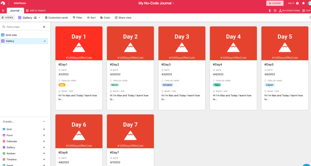 To follow on from yesterday’s task we’ll be creating a form to capture your daily journal entries and send them straight into your Airtable base. Whether you’re using a spreadsheet, a social media site, an app or a website, all of the content you see is data, and crucially it is both generated and stored somewhere. Data (or content) can be generated by you, your users, an API you’ve called or somewhere else. So whilst creating a form today will help us build out our digital journal, you’ll find that forms are a key ingredient to many no-code projects you create.
